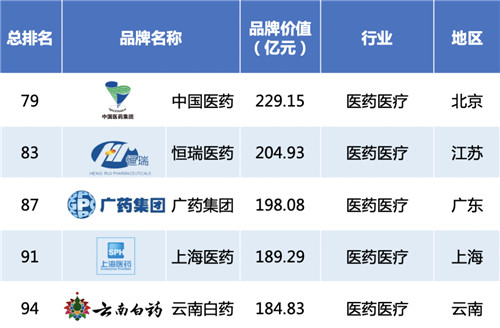 在《2020中国品牌500强》上榜品牌中,医药医疗行业共有55个品牌上榜,中国医药229.15亿元的品牌价值位列行业第1名、总榜单的第79名。恒瑞医药、广药集团和上海医药分别以204.93亿元、198.08亿元和189.29亿元位列行业的2至4位。