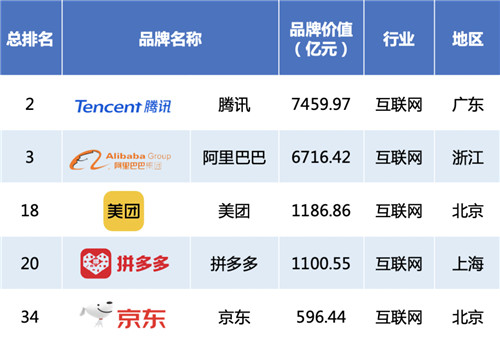 在《2020中国品牌500强》上榜品牌中,互联网行业共有41个品牌上榜,腾讯7459.97亿元的品牌价值位列总榜单第2名、行业的第1名。阿里巴巴以6716.42亿元的品牌价值位居总榜单第3位,行业第2位。