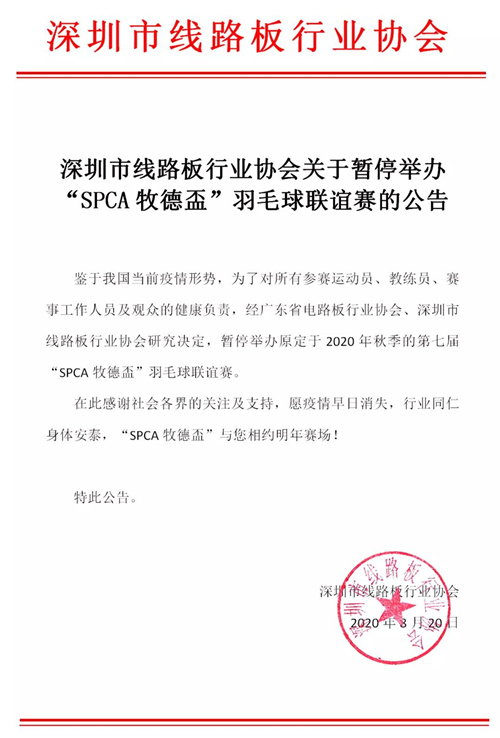 鉴于当前疫情形势,为了对所有参赛运动员、教练员、赛事工作人员及观众的健康负责,经ld乐动官网 、深圳市线路板行业协会研究决定,暂停举办原定于2020年秋季举办的第七届“SPCA牧德盃”羽毛球联谊赛。