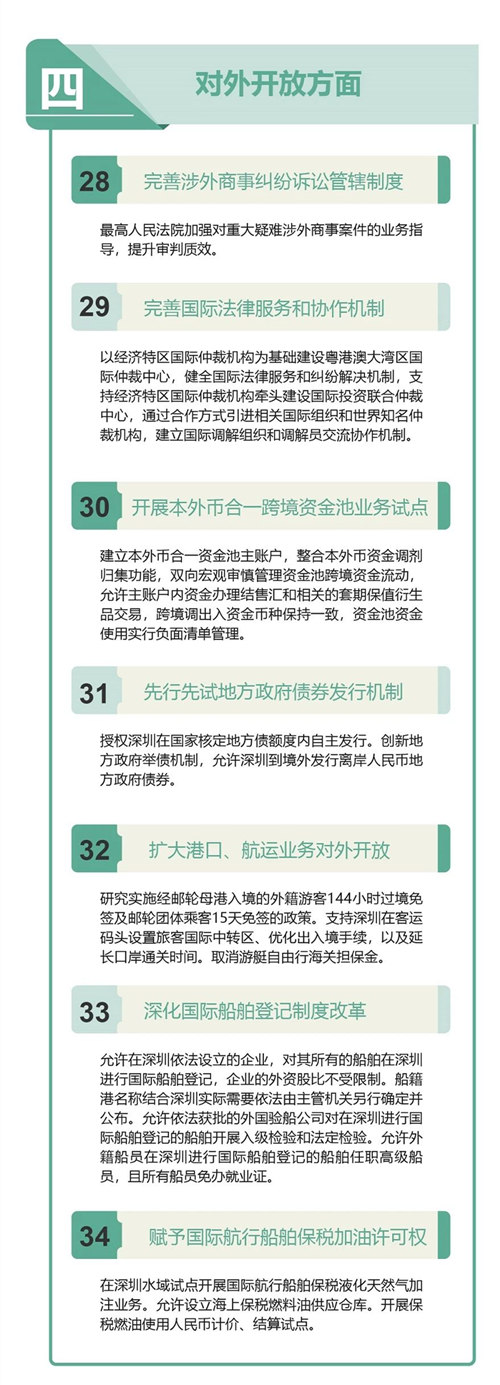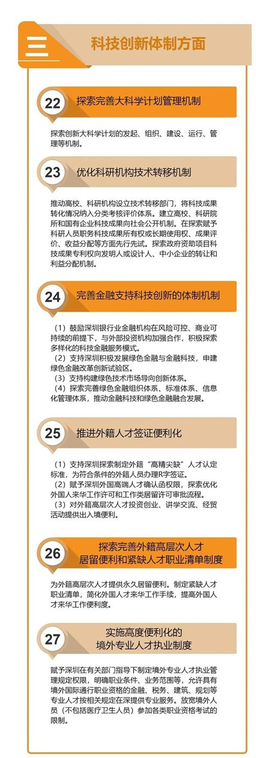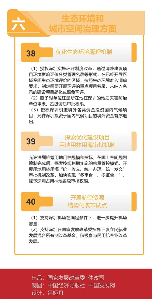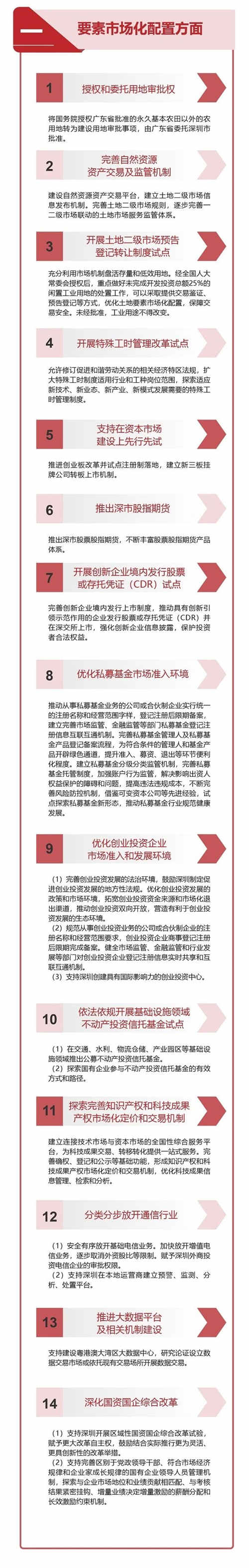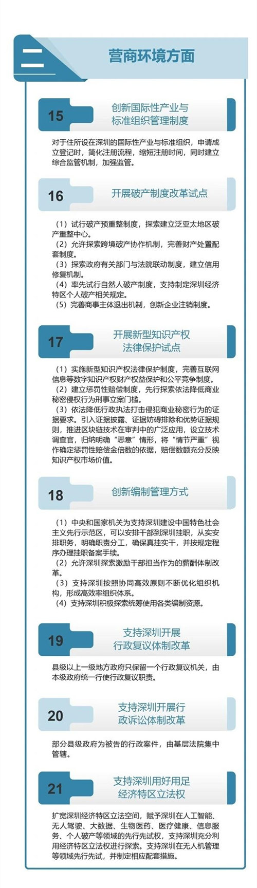 10月18日,国务院新闻办公室举行新闻发布会。会上,《深圳建设中国特色社会主义先行示范区综合改革试点首批授权事项清单》正式发布。清单共有40条授权事项,包括要素市场化配置、营商环境、科技创新体制、对外开放、公共服务体制、生态环境和城市空间治理等六个方面。各条中明确了改革事项的主要内容,赋予深圳在重要领域和关键环节改革上更多自主权。