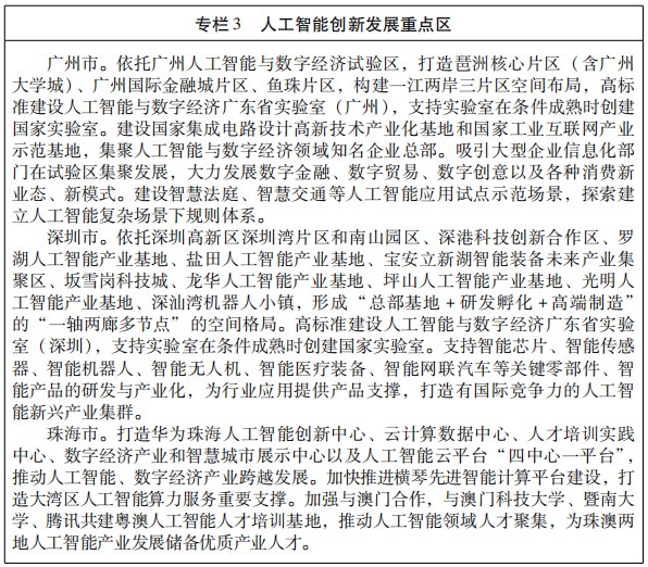 3.加快建设人工智能、区块链等新一代通用信息技术生态体系。支持广州、深圳推进国家新一代人工智能创新发展试验区和国家人工智能创新应用先导区建设,打造人工智能技术创新策源地、集聚发展新高地、开放合作重点区和制度改革试验田。推进人工智能开放创新平台建设,推动重点软硬件基础平台开源共享,支持深圳构建新一代国家人工智能基础开源平台,形成多元创新主体共同参与、协同创新平台有力支撑、场景应用深入融合的人工智能产业生态圈。突出发展智能无人机、智能无人船、智能机器人等智能产业,加快建设国家无人机系统质量监督检验中心,支持建设珠海无人船海测基地、湛江水下机器人测试基地等。加速培育人工智能辅助诊断、人工智能辅助医疗等智能医疗产业发展。支持建设一批区块链基础架构、安全保护、跨链互操作、链上链下数据协同、监管等区块链基础平台型重大项目,鼓励区块链领军企业建设自主区块链底层技术平台和开源平台。支持广州建设国家区块链发展先行示范区,支持打造广州、深圳、珠海、佛山、东莞等区块链产业集聚区。(省科技厅、省工业和信息化厅牵头,省发展改革委、有关市政府按职责分工负责)