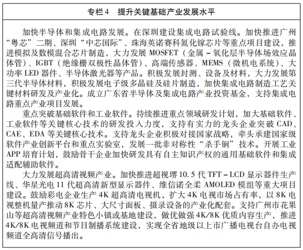 4.提升关键基础产业发展水平。重点突破高端通用芯片设计,大力发展第三代半导体芯片,前瞻布局毫米波芯片、太赫兹芯片等;优先发展特色工艺制程芯片制造,支持先进制程芯片制造,积极推进数模混合芯片制造,探索发展FDSOI、异构集成等新技术路径。支持大型工业软件企业突破CAD、CAE、EDA等关键核心技术,开展工业APP培育计划,鼓励骨干企业加快研发具有自主知识产权的通用基础软件和集成适配辅助软件,推动国家通用软硬件适配测试中心建设。以片式化、微型化、集成化、高性能为目标,重点突破关键材料、核心电子元器件研发瓶颈,向中高端电子元器件研发与产业化发展。推进超高清视频产业发展试验区建设,布局建设一批省超高清视频产业园区,建设广佛惠世界级超高清视频和智能家电产业集群,争取开通新的4K电视频道,建设100个以上超高清视频应用示范项目。(省发展改革委、省工业和信息化厅牵头,省科技厅、省广电局、有关市政府按职责分工负责)