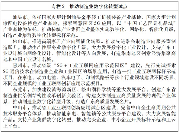 2.推动制造业数字化转型。聚焦战略性支柱产业和新兴产业集群,深入推动数字化、智能化、网络化转型。支持规模以上工业企业开展生产线装备智能化改造,重点实施以传统制造装备联网、关键工序数控化等为重点的技术改造,加快先进智能装备和系统普及应用,建设智能生产线、智能车间和智能工厂。推动5万家以上工业企业运用工业互联网实施软硬一体的数字化改造。推动龙头制造企业依托工业互联网平台,与上下游产业链企业实现深度互联,打造全产业链信息数据链,提升信息、物料、资金、产品等配置流通效率。进一步发展壮大省工业互联网产业生态供给资源池,培育超过500家具备较强实力的工业互联网服务商。推动企业“上云用数赋智”,开展数字化转型促进行动,争取国家支持,建设一批国家数字化转型促进中心,鼓励发展数字化转型共性支撑平台和行业“数据大脑”。培育发展一批跨行业跨领域和特定行业特定领域工业互联网平台,搭建平台企业与中小微企业对接机制。推动特色产业集群数字化转型,鼓励有条件的地区和企事业单位创建行业型、区域型、企业型数字化转型服务平台,提升产业集群工业企业整体数字化转型能力。实施“定制之都”示范工程,围绕定制家居、汽车、时尚服饰、智能终端、专业服务等重点领域,打造集总部经济、展示体验为一体的产业集聚园区。(省工业和信息化厅牵头,省发展改革委、有关市政府按职责分工负责)