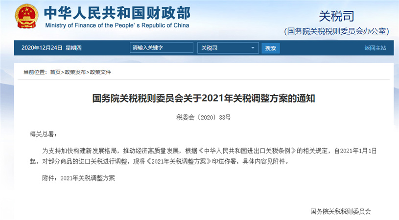 2020年12月23日,国务院关税税则委员会以税委会〔2020〕33号文,发布《关于2021年关税调整方案的通知》。