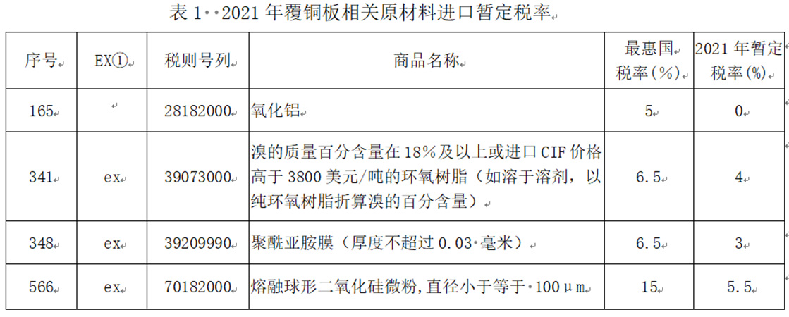2021年与覆铜板相关的原材料维持2020年的暂定进口优惠税率不变,具体见表1 (33号文附表1《进口商品最惠国暂定税率表》)。