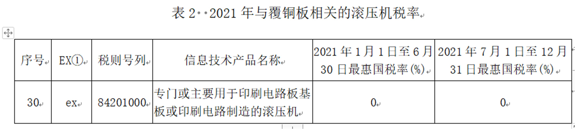 另外,33号文中附表2《部分信息技术产品最惠国税率表》中,有与覆铜板相关的滚压机税率(见表2)。
