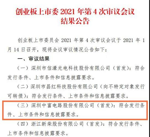 1月14日,创业板上市委2021年第4次审议会议结果显示,深圳中富电路股份有限公司(下称“中富电路”)符合发行条件、上市条件和信息披露要求。