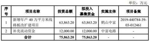 最新披露的招股书显示,中富电路拟募资7.59亿元,用于年产40万平方米线路板改扩建项目、补充流动资金。项目建成达产后,预计新增各类PCB产品的产能40万平方米。
