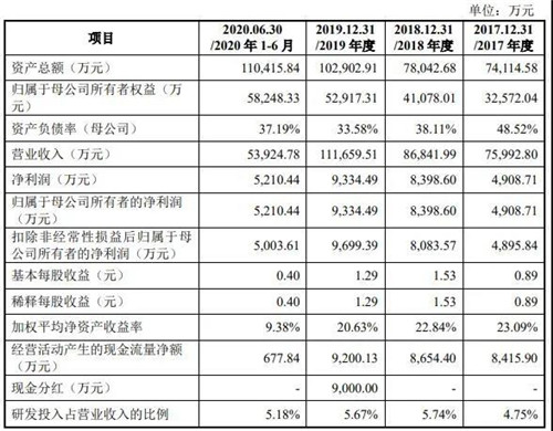 受益于5G基站建设对PCB产品需求的攀升,中富电路的业绩凸显出较强的成长性,呈高速增长状态。2017年至2020年上半年,其营收分别为7.60亿元、8.68亿元、11.17亿元和5.39亿元,2017年至2019年年复合增长率达21.22%;相应净利润分别为0.49亿元、0.84亿元、0.93亿元和0.52亿元。