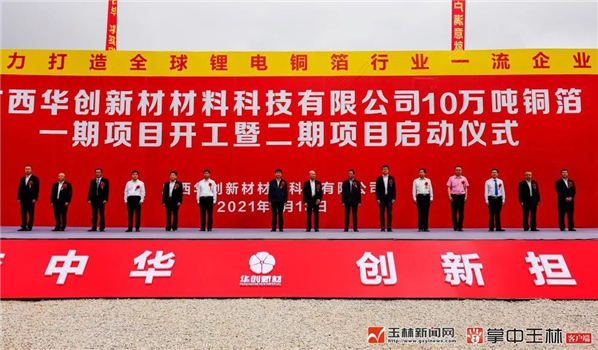 当天上午,广西华创新材材料科技有限公司10万吨铜箔一期项目开工暨二期项目启动仪式在龙潭产业园区举行。浙江华友控股集团董事长陈雪华,浙江华友控股集团总裁汪海涛,广西时代锂电材料科技有限公司总经理卢群,中国电子材料行业协会副秘书长、电子铜箔材料分会秘书长冷大光,华创新材董事长兼总经理周盛夫等,丘德奎、蔡文、何东真等市领导共同出席启动仪式。
