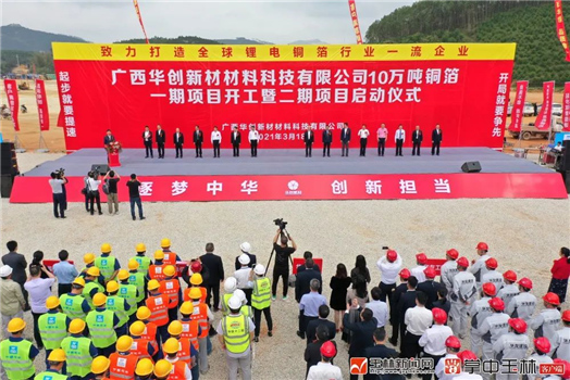 继2020年广西时代锂电材料科技有限公司投资推进的70万吨锂电新能源材料一体化产业基地项目(一期)开工后,根据项目战略计划需要,3月18日,由广西华创投资推进的年产10万吨铜箔项目正式开工。