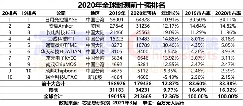 根据芯思想研究院(ChipInsights)日前发布全球封测十强榜单显示,2020年全球十大封装厂分别是:日月光、安靠、长电科技、力成科技、通富微电、华天科技、京元电子、南茂、颀邦、联合科技。