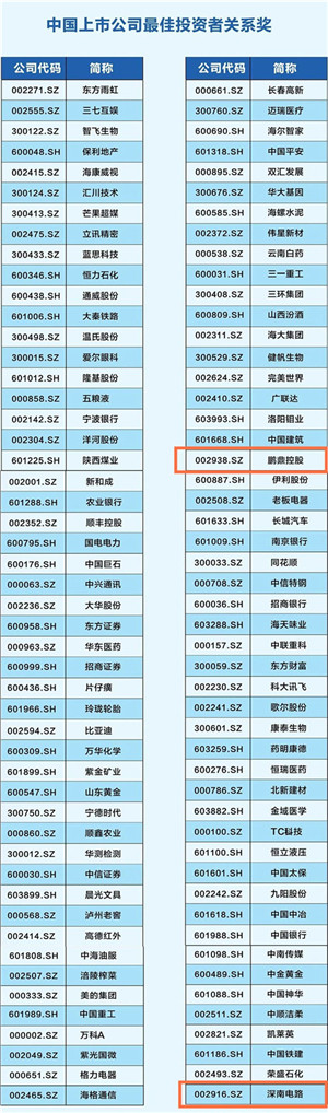 鹏鼎控股、深南电路获中国上市公司最佳投资者关系奖;