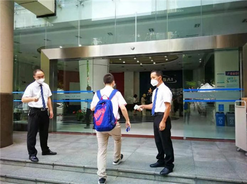 把关严起来!门卫查验通行码,测体温;访客登记备案,须持绿码通行;办公区域要求全员佩戴好口罩。