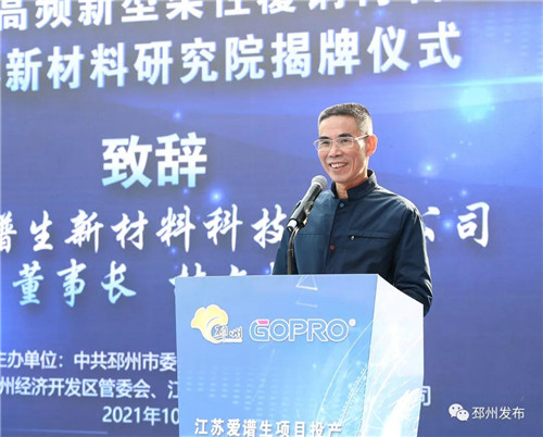 江苏爱谱生新材料科技有限公司董事长林文坤在致辞中表示,在邳州市委、市政府大力支持下,仅用1年时间就实现了从开工到投产的奇迹,共同打造了邳州速度、光莆速度。公司将以强大的技术研发能力和平台优势,整合资源、扎根邳州,打造行业技术领先的智能智慧制造业标杆企业,为更多的合作伙伴提供优质满意服务,为邳州经济发展作出贡献。