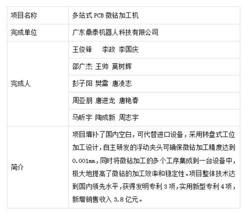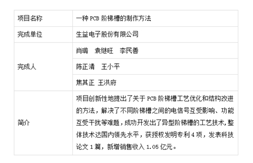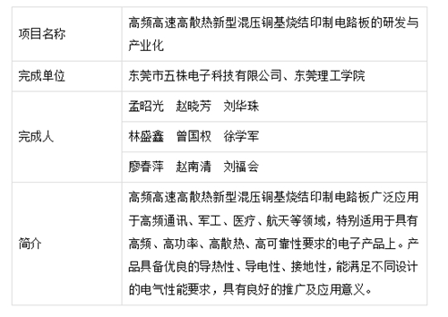 根据东莞市高新技术产业协会此前公布的2021年创新东莞科学技术奖获奖名单,生益电子股份有限公司的“一种PCB阶梯槽的制作方法”项目获得“2021年创新东莞技术发明奖”;东莞市五株电子科技有限公司、东莞理工学院的“高频高速高散热新型混压铜基烧结印制电路板的研发与产业化”、广东鼎泰机器人科技有限公司的“多站式PCB微钻加工机”项目获得“2021年创新东莞科技进步二等奖;生益电子股份有限公司纪成光获得“2021年创新东莞青年科技创新奖”。