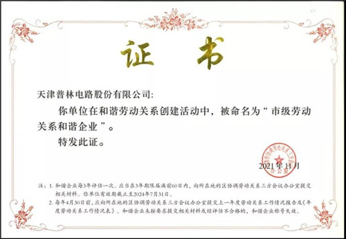 天津普林本次入选天津市“市级劳动关系和谐企业名单”,是对公司劳动关系工作的充分肯定,也是公司严格执行劳动保障法律法规政策、规范劳动用工管理、落实劳动安全保护措施、维护广大员工合法权益取得的阶段性成果,公司将再接再厉,不断提高劳动保障管理层次和水平,更好地发挥劳动关系和谐企业的示范引领作用。