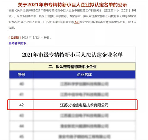 江苏艾诺信拟获淮安市“专精特新中小企业”认定