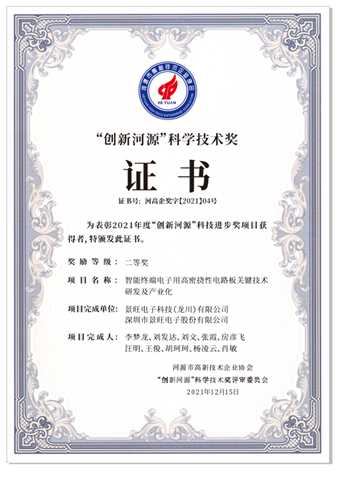 近日,由景旺电子申报的“智能终端电子用高密度挠性电路板关键技术研发及产业化”项目,经“创新河源”科学技术奖评审委会评审,荣获“创新河源”科学技术奖二等奖。